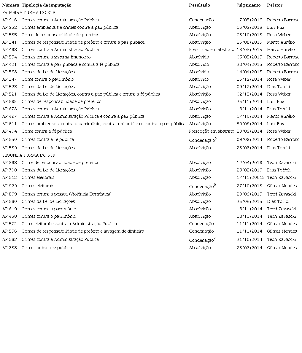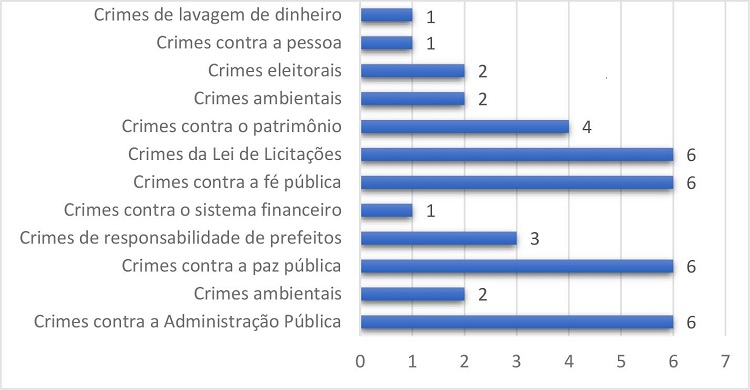 Com uma pequena exceção pontual, os tipos de crime julgados pelo Supremo Tribunal Federal, no período em análise, se referem, em regra, a delitos cometidos sem o emprego de violência ou grave ameaça contra a pessoa e que possuem como vítima, direta ou indireta, o Estado. Há, ainda, uma prevalência de crimes funcionais, nos quais a condição de funcionário público8 é necessária para a prática do delito, como é o caso dos crimes cometidos por prefeitos no exercício da função e por gestores públicos em processos licitatórios, bem como dos crimes contra a Administração Pública propriamente ditos cometidos por agentes estatais.