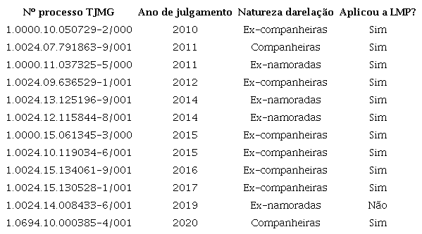 Em onze casos o TJMG entendeu pela aplicação da LMP. Há uma diversidade de argumentos para fundamentar sua aplicação: em quatro deles, o tribunal entendeu haver uma relação doméstica, familiar ou de afetividade; em três, aplicou-se o art. 5º, parágrafo único; em um, agregou-se o argumento da natureza da relação com o art. 5º, parágrafo único; em um, utilizou-se o argumento da existência de uma relação de dominação combinado com o art. 5º, parágrafo único; em um, não se discutiu a aplicabilidade da LMP, mas tão somente a condenação em primeira instância. No único caso em que não se aplicou a lei, discutiu-se a inexistência de uma relação íntima de afeto (entendeu-se que não havia namoro ou envolvimento amoroso, duradouro e estável). A fundamentação da maior parte das decisões pela admissibilidade da aplicação da LMP é fortemente ancorada em precedentes do STJ que determinam que o polo ativo pode ser ocupado por homens e mulheres (desde que o polo passivo seja mulher), sem maiores aprofundamentos sobre as nuances do caso concreto.