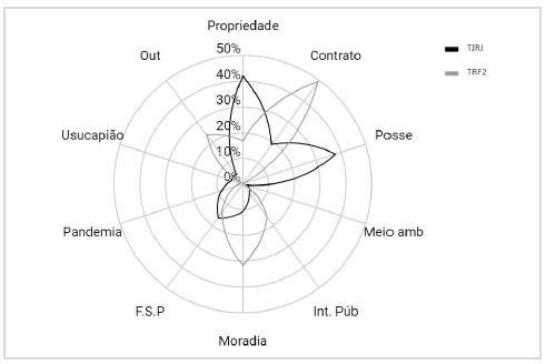 O direito à moradia foi mais mencionado no TRF2 (32%) do que no TJRJ (11%), embora naquele a menção ao direito tenha resultado em julgamento favorável ao ocupante atual do imóvel em apenas 7 casos (7%). Nos demais 25 casos, o direito à moradia foi invocado apenas para se afirmar que ele não é absoluto ou para privilegiar o proprietário. A função social da posse ou da propriedade foi mencionada em proporções aproximadas no TJRJ (16%) e TRF2 (14%). A pandemia foi amplamente ignorada tanto pelo TJRJ (9%) quanto pelo TRF2 (3%). A usucapião foi encontrada em mais decisões do TJRJ (5%) do que do TRF2 (1%). As decisões envolveram outros fundamentos em 24% dos casos do TRF2 e 5% do TJRJ. A diferença do padrão decisório de ambos os tribunais está representada nas Figuras 1 e 2:
