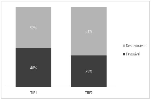 Em resumo, constatamos uma relevante diferença entre os padrões decisórios do TRF2 e TJRJ, em harmonia com os achados de Ribeiro e Cafrune (2020). O direito de propriedade foi mais frequente nas decisões do TJRJ (42%) do que nas do TRF2 (17%). Em contraste, argumentos relacionados a descumprimento contratual foram mais presentes no TRF2 (50%) do que no TJRJ (19%).
