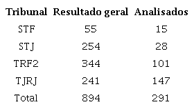 A pesquisa nos repositórios de jurisprudência dos tribunais retornou 894 decisões, das quais 291 atenderam aos critérios de inclusão, isto é, examinaram o mérito de pedido de reintegração de posse ou imissão na posse. A composição da amostra pode ser vista na tabela abaixo: