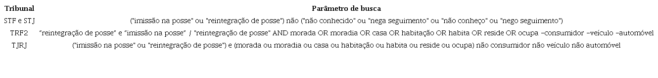 Não foi possível utilizarmos as mesmas palavras-chave em todos os buscadores de jurisprudência. Primeiro, porque a diferença de competência dos tribunais implica variadas frequências do tema no universo de decisões - e.g. o STF aprecia muito menos pedidos de reintegração de posse do que o TJRJ. Assim, as expressões de busca tiveram de ser mais específicas no segundo tribunal do que no primeiro, sob pena de inviabilização do trabalho. Segundo, porque o site de cada tribunal apresenta diferentes limitações de pesquisa em seu repositório de jurisprudência. O do STJ, por exemplo, aceita diversos operadores booleanos, em contraste com o do TRF2.
