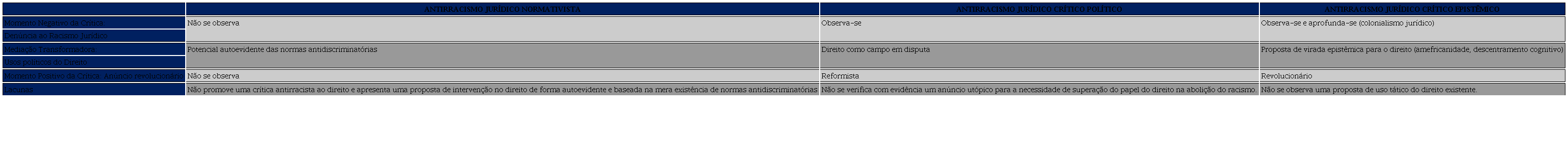 Em síntese, o quadro 1 apresenta as caraterísticas essenciais das diferentes correntes de antirracismo jurídico e suas lacunas, em relação ao combate ao racismo e sua dimensão estrutural.