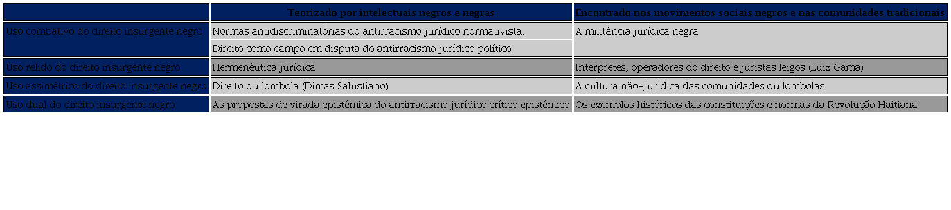 Em suma, o quadro a seguir pode sintetizar os usos políticos táticos do direito insurgente negro, tais como foram aqui elaborados: