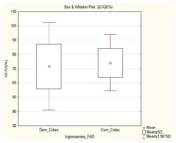 Ao analisarmos o Gráfico 1, podemos observar que o desvio padrão em relação aos discentes que ingressaram após a implantação do sistema de cotas é ligeiramente inferior ao dos que ingressaram antes da adoção do referido sistema. Figurativamente, os percentuais de concluintes com o sistema de cotas iniciam acima de 60, enquanto que sem o referido sistema o número cai para casa de 50, com ambos coeficientes finalizando na casa de 80. Ressaltamos ainda que a variabilidade (desvio padrão = 15,683, conforme Tabela 2) na porcentagem de concluintes do período anterior ao sistema de cotas é maior do que a dos concluintes que ingressaram após a implantação das cotas sociais (desvio padrão = 10,061).