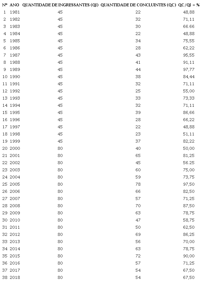 Com base na Tabela 1, é possível constatar que, entre 1981 e 2006, a média aritmética entre concluintes e ingressantes corresponde a 71,69 (setenta e um inteiros e sessenta e nove centésimos). Utilizamos o mesmo critério para constatar que, no período de 2007 e 2018, essa média se eleva para 74,1 (setenta e quatro inteiros e um décimo), havendo uma discreta variação para mais.