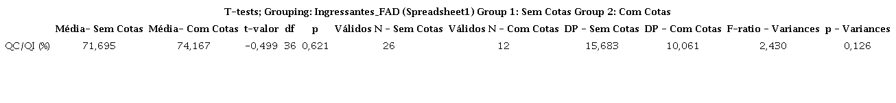 Como o valor de tcalc = -0,499 encontra-se na região de aceitação (ttab = 2,0211) concluímos que não existe diferença significativa, ao nível de 5%, entre as porcentagens de conclusão de curso dos discentes que entraram antes e após da implantação das cotas sociais. Portanto, confirma-se a hipótese H0.
