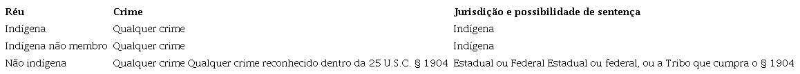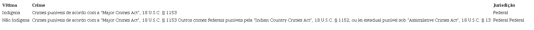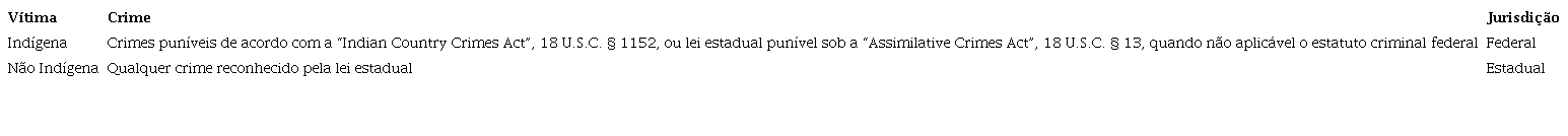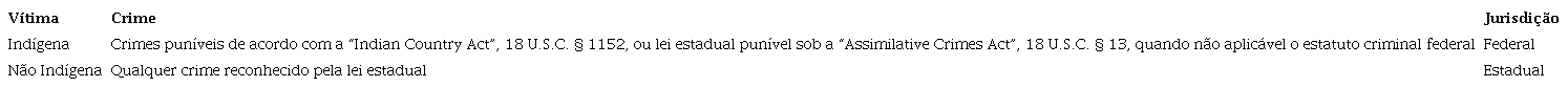 Em suma, a jurisdição federal sob a “Federal Enclaves Act” e a “Assimilative Crimes Act” se estende apenas aos crimes em que um indígena está envolvido como réu ou como vítima (DIEBEL; JOHNSON; MULLEN, 2020).