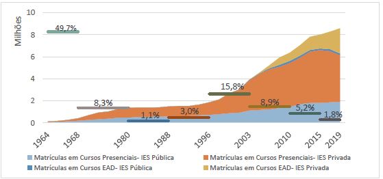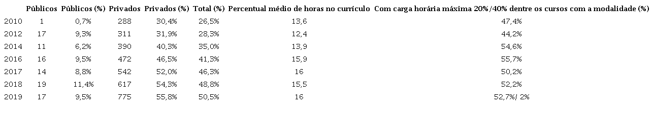 Em 2018, a carga horária na modalidade de EAD em cursos de graduação presenciais foi flexibilizada para 40% da carga horária total do curso para IES que cumprissem os requisitos do art. 3º da Portaria 1.428 do MEC. Já em 2019, a possibilidade de 40% EAD em cursos presenciais foi aberta para qualquer curso, conforme Portaria 2.117 do MEC. Apesar de provavelmente não terem tido seus efeitos totais, já é possível ver, na Tabela 3, que os cursos privados tiveram boa adesão às mudanças.