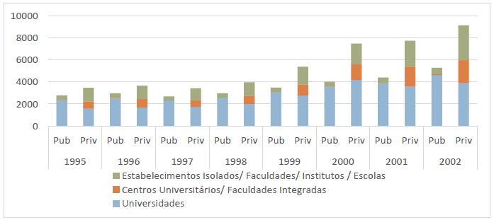 As matrículas recomeçam a crescer em 1995, com o aumento de pessoas concluindo o ensino médio (SAMPAIO, 2000, p. 89-92); a guinada no crescimento do número de cursos, entretanto, é observada após 1998 (ver Gráfico 2).