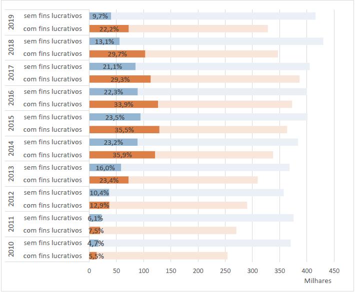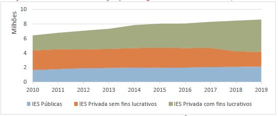 Dentre as privadas, as IES com fins lucrativos passaram as sem fins lucrativos em 2017 - ano em que elas se tornaram o tipo predominantes de IES no Brasil. Em 2019, as IES privadas com fins lucrativos eram 54% do total de IES. O mesmo movimento pode ser observado em relação às matrículas (ver Gráfico 3).