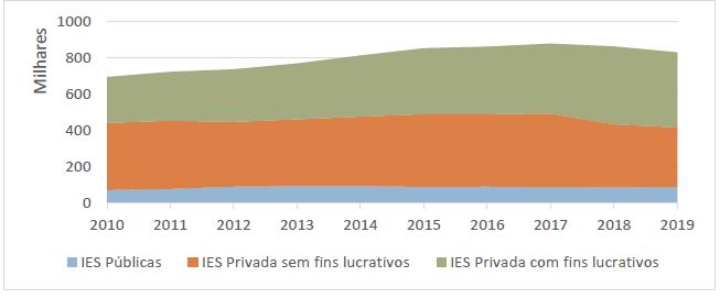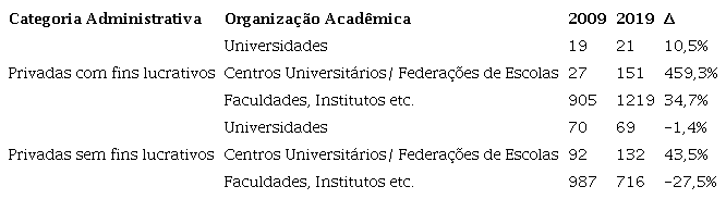 Entre 2009 e 2019, é claro o avanço das IES privadas com fins lucrativos, especialmente das instituições não universitárias (ver Tabela 2).