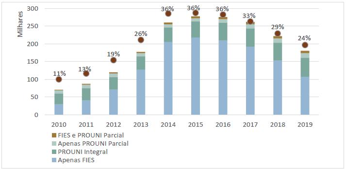 No período, o governo atuou também na expansão e na democratização do ensino privado. Em 2005 foi criado o Programa Universidade para Todos (PROUNI, Lei 11.096) e em 2010 começou-se a investir grandes somas no Fundo de Financiamento Estudantil (FIES). O PROUNI permitiu que as instituições privadas aderentes ao programa tivessem novamente isenção fiscal de alguns tributos11. Para conquistarem tal benefício, as IES devem oferecer bolsas na proporção mínima de uma bolsa integral para cada 9 estudantes pagantes, respeitando-se a métrica dos cursos. Os beneficiários do programa, selecionados por meio do Exame Nacional do Ensino Médio (ENEM), são egressos de escola pública que se encaixem no perfil socioeconômico determinado, além de pessoas com deficiência e de docentes da rede pública para formação em educação. Ainda, o programa determina que um percentual das bolsas deve ser destinado à implementação de ações afirmativas. É indiscutível a importância do PROUNI na democratização do ensino superior. Não há, contudo, dúvidas de que o programa aumentou a rentabilidade das instituições privadas. A principal razão para tanto é que além da isenção fiscal, a aderência ao PROUNI dá direito à prioridade na distribuição dos recursos do FIES.