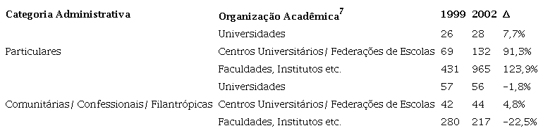 Em 1999, o Censo da Educação Superior começou a classificar as instituições privadas em particulares (incluindo IES com e sem fins lucrativos) ou comunitárias, confessionais e filantrópicas (todas sem fins lucrativos). É, contudo, apenas em 2010 que as IES são qualificadas enquanto possuindo ou não fins lucrativos. Entre 1999 e 2002, final do governo FHC, as IES particulares haviam crescido e as comunitárias, confessionais e filantrópicas haviam encolhido (ver tabela 1). O ritmo, contudo, poderia ter sido ainda maior. De 1997 a 2000, o MEC recebeu 9.032 novas solicitações para autorização de cursos ou criação de novas habilitações em cursos existentes. Dessas, 20,1% (1.818) foram aprovadas. No caso do curso de Direito, 70 das 1.160 (6%) solicitações foram aprovadas (Paraguassú, 2001).