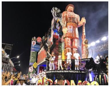 O carro alegórico, assim como o desfile, era rico em referências à disputa por memória social e a luta contra a dupla morte - ou seja, além do extermínio físico do corpo negro, a eliminação de sua recordação coletiva - ressaltando a violência contra a comunidade pobre e negra, trazendo o papel da cultura Hip-Hop, e do próprio samba, como forma de escrever e contar em primeira pessoa a história do povo oprimido. Além da ação do movimento Revolução Periférica, também se fez menção a intervenção política do artista plástico João França, mais conhecido como Negro M.I.A (Massive Ilegal Arts), esteve ao lado de Galo e Biu, onde o mesmo carro alegórico reproduziu a frase “Olhai por nóis”, que ficou famosa após ser pixada no Pateo do Collegio em 2018; a frase também remonta ao desfile “Ratos e Urubus, larguem minha fantasia”, comandado por Joãosinho Trinta, para a Escola de Samba Beija-Flor, em 1989, protestando contra a censura por ter levado um carro alegórico com o Cristo Redentor representando pessoas negras em situação de rua no sambódromo carioca: “Mesmo proibido, olhai por nós!”39. Ainda sobre o carnaval paulistano de 2024, outra frase que também chamou atenção no mesmo carro alegórico fazia menção a pandemia: “Distanciamento social sempre existiu!!! Bem vindos ao ‘Brazil’.” É possível dizer assim que há uma construção de memória coletiva de protestos, a partir da experiência negra e periférica subalternizada, levadas ao público pelas escolas de samba.