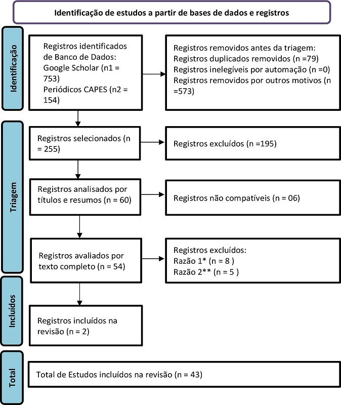 Concernente à identificação e seleção dos trabalhos, tiveram como referência as orientações PRISMA 2020 (PAGE et al., 2021). Os dados foram extraídos das publicações científicas disponíveis eletronicamente, com a seleção dos estudos com base nos critérios de elegibilidade, sob o recorte do tema judicialização da saúde e das respostas de enfrentamento, quando foram utilizadas as bases de dados Google Scholar e Portal de Periódicos CAPES. A organização dos títulos se deu a partir de trabalhos que correspondem aos seguintes critérios: (a) redigidos em português, (b) com estrutura de artigo científico, tese ou dissertação; (c) disponíveis em seu inteiro teor de forma gratuita, (d) identificáveis por meio da busca combinada de descritores, (e) sem limitação de ano. A busca no Google Scholar resultou em um total de 753 títulos, conforme quadro 1, enquanto no Periódicos CAPES resultou em 154 títulos, conforme quadro 2. A escolha dos descritores deu-se a partir da bibliografia pesquisada.