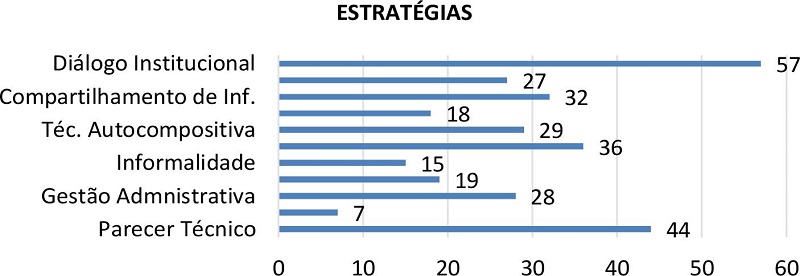 A categoria “estratégias” está representada no gráfico 1. Os códigos que a compõem representam as ações empregadas nos programas de desjudicialização. São ideias inovadoras, melhorias gerenciais, tecnologia digital, diálogos interinstitucionais estabelecidos entre vários entes, celebração de acordos e ajuste de cooperação, capacitação, troca de informações, atitudes desenvolvidas e empregadas para minimizar ou evitar a judicialização da saúde.