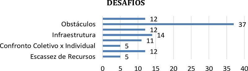 Nas ações de enfrentamento à judicialização, os autores também relatam desafios e obstáculos a serem superados. Há relatos de fatores impeditivos que obstaram os programas e as ações de alcançarem seus objetivos, ou ainda posturas transitórias, circunstanciais, que requerem a atuação proativa dos envolvidos para a superação e bom desenvolvimento dos projetos. Esses fatores estão codificados na categoria “desafios”, conforme gráfico 4.