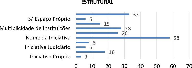 Relacionado ao designer dos programas e iniciativas, a categoria “estrutural” representa a formatação das ações de resposta à judicialização encontradas na literatura. No gráfico 5 são representados os códigos vinculados a essa categoria, que relatam os nomes das respostas, os atores envolvidos, se há uma multiplicidade de instituições que fazem parte do convênio ou que auxiliam na execução das atividades e desenvolvimento do programa.
