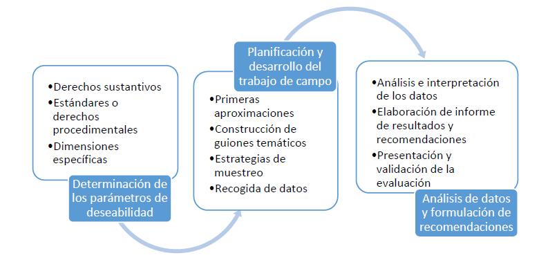 En ese marco, identificamos tres grandes fases de las investigaciones evaluativas (la determinación de los parámetros de deseabilidad; la planificación y desarrollo del trabajo de campo; el análisis de los datos y la formulación de recomendaciones) y precisamos diversos componentes de los diseños cualitativos a partir del enfoque de derechos humanos, de manera que posibiliten recuperar las perspectivas y significados construidos por las personas en relación a la garantía y disfrute de los derechos sometidos a evaluación.