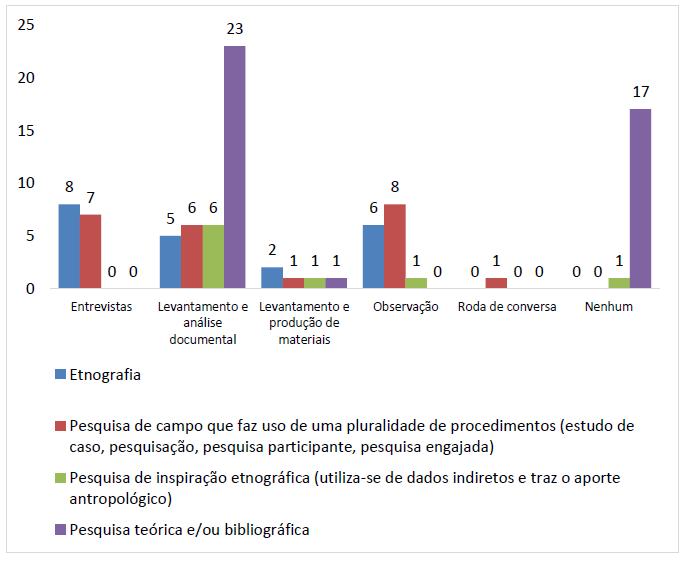 Ainda observando o gráfico, chama a atenção que em 80% dos artigos que afirmaram o uso de procedimentos metodológicos (ou 59% do total), houve a realização de “levantamento e análise documental”. 32 artigos (48%) recorreram a apenas um procedimento metodológico (não houve combinação entre eles). Os procedimentos de “entrevistas”, “observação” ou “levantamento e produção de materiais” foram utilizados isoladamente apenas uma vez cada. Os demais 29 artigos que recorreram a apenas um tipo de procedimento de pesquisa usaram “levantamento e análise documental”, estando 23 deles ligados à técnica “pesquisa teórica e/ou bibliográfica” e 6 ligados à técnica “pesquisa de inspiração etnográfica”. O recurso a esse procedimento metodológico indica que, ainda que prevaleçam pesquisas teóricas, existe a preocupação no campo de promover diálogo entre dados bibliográficos e documentais.