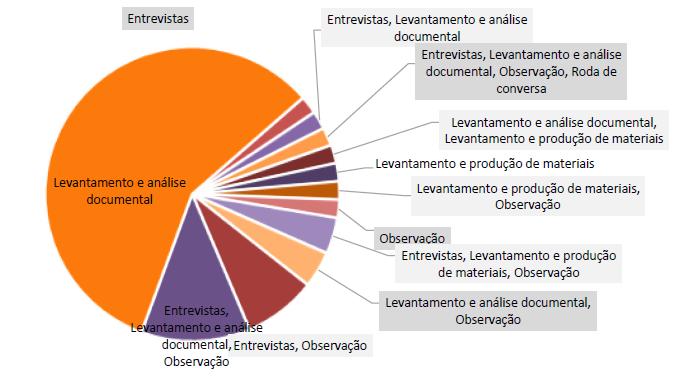 O levantamento indicou ainda que, em especial as pesquisas identificadas com as estratégias de “etnografia” e de “pesquisa de campo que faz uso de uma pluralidade de procedimentos”, há uma tendência à combinação entre procedimentos. No gráfico abaixo é possível ver as frequências de utilização combinada e isolada de cada procedimento metodológico.