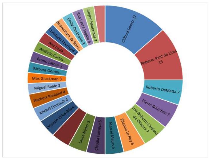 Ao visualizarmos a frequência dos autores de referência utilizados, percebemos a predominância de aportes teóricos caracterizados sobretudo pela proposição de alicerces epistemológicos e metodológicos percebidos enquanto clássicos ou centrais ao longo da "trajetória antropológica no estudo do Direito” (KANT DE LIMA, 2009, p. 226).