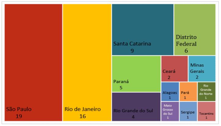 Em relação aos veículos de publicação do conjunto de trabalhos objeto desta pesquisa, a figura abaixo ilustra a distribuição dos veículos nacionais responsáveis pelas publicações abarcadas neste estudo (números absolutos) em relação aos estados do Brasil.