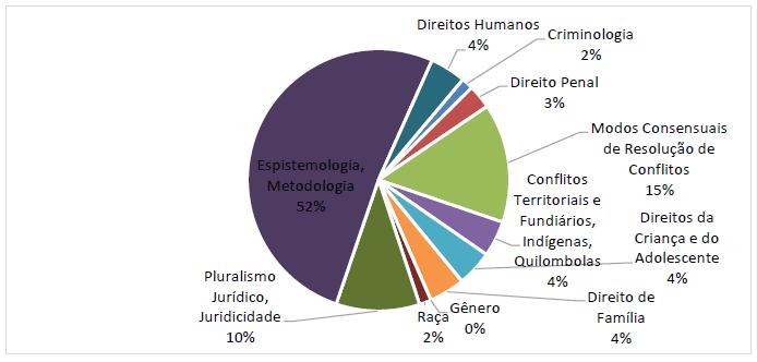 Observando os dois últimos gráficos em conjunto, é possível verificar que há uma grande ocorrência de temas que poderiam ser considerados como já “tradicionais” na pesquisa jurídica, no sentido de que eles coincidem com o próprio surgimento de certas áreas como a sociologia do direito no Brasil (JUNQUEIRA, 1996). Por isso não é inusitado que encontremos resultados como 14,7% de trabalhos sobre “modos consensuais de resolução de conflitos” e “acesso à justiça”, assim como 10,3% de trabalhos distribuídos na temática do “pluralismo jurídico”.