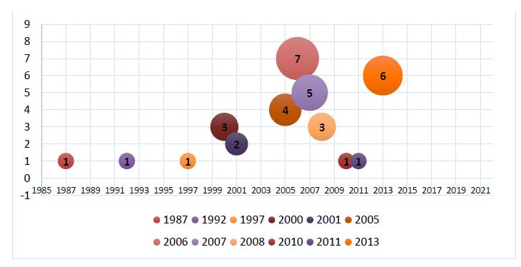 Neste gráfico, cada círculo corresponde a um ano de produção (eixo X), bem como sua dimensão é representativa da quantidade de trabalhos publicados, que pode ser conferida no eixo Y. Cabe ressaltar que há um período longo - entre 1985 e 2005 - sem uma produção significativa de artigos indexados. Contudo, apesar de não haver produção indexada, houve aumento relativo no número de publicações de teses e dissertações em antropologia do direito, como se pode observar no Gráfico 4.
