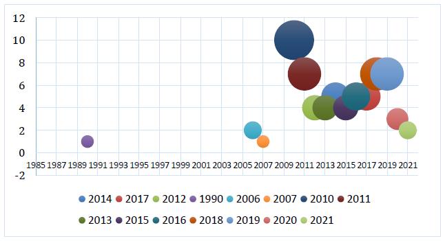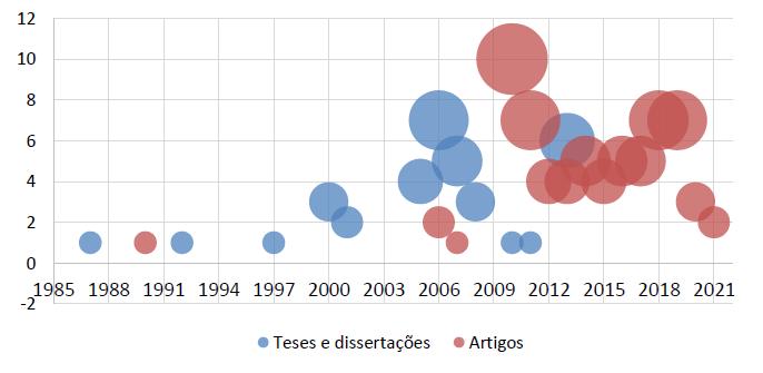 No gráfico acima, o Eixo X corresponde às datas de publicação dos artigos, num intervalo que vai de 1985 a 2021. O eixo Y indica o número de trabalhos publicados e indexados. No caso das teses e dissertações, que estão representadas nos círculos em vermelho, não foi feita uma segregação entre essas duas naturezas de trabalho, devido a esta ser uma análise preliminar dos resultados no portal da CAPES. Já os círculos em amarelo, representam o número de artigos científicos publicados, tendo-se utilizado a coleta feita para a produção do presente trabalho.