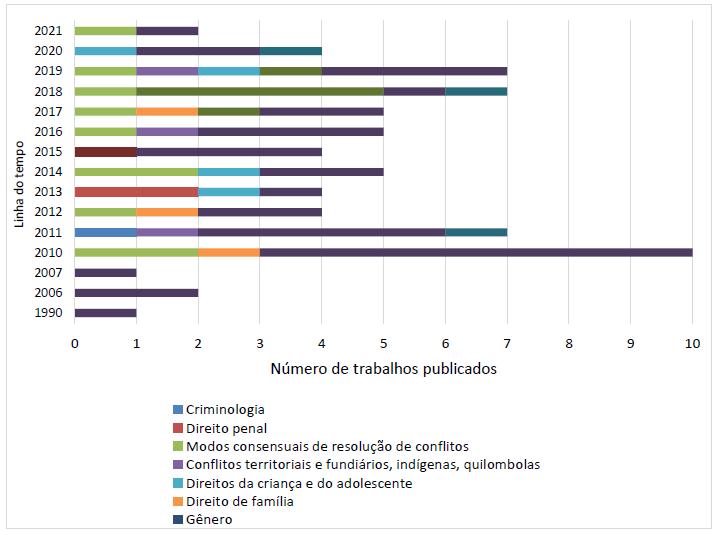 Assim, inscreve-se com produção estável o tema “Direitos da criança e do adolescente”, o que se alinha com a promulgação do Estatuto da Criança e do Adolescente (ECA), bem como de legislação específica acerca das políticas de responsabilização relativa a esse grupo. Também os estudos de “Criminologia” e na área de “Direito Penal”, que guardam relação estreita entre si, foram profícuos a partir de 2010. Em diálogo com essas áreas, também ganha relevo a produção sobre “Direitos Humanos”, com trabalhos indexados na área a partir de 2011. Por outro lado, o tema “Modos consensuais de resolução de conflitos” ganha produção a partir de 201013, tornando-se recorrente e com elaboração relativamente estável ao longo dos anos em que foi realizada a amostra. Como se verifica, o ritmo da produção nesse ano mais do que multiplicou, ganhando resiliência.