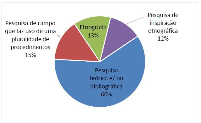 É notória a incidência de “pesquisas teóricas e/ou bibliográficas” na amostra, tendo a técnica embasado 60% dos trabalhos. O dado indica haver uma menor familiaridade dos autores do campo da antropologia do direito com pesquisas de campo, havendo preferência por pesquisas bibliográficas aliadas ou não à pesquisa documental. É possível, ainda, que a predominância de pesquisas de autoria individual (73,2%) esteja ligada à opção por estratégia teórica ou bibliográfica. Referida hegemonia parece dialogar com os tensionamentos metodológico e disciplinar indicados por Kant de Lima e Baptista (2014), já referidos em tópico anterior.