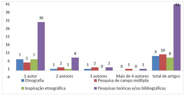No gráfico, é possível perceber que há uma prevalência dos artigos com autoria individual. Somados, os 49 textos produzidos por apenas um autor representam 72% do universo de 68 artigos. Eles têm especial prevalência dentre as pesquisas de inspiração etnográfica (87,5%), mas também dentre etnografias e pesquisas teóricas e/ou bibliográficas há recorrência acima da média global (77,8% e 73,2%, respectivamente). Pesquisas de campo que recorrem a uma pluralidade de procedimentos são aquelas que, proporcionalmente, têm maior incidência de coautorias (50%). Apesar de metade desses artigos que lançaram mão de uma pluralidade de técnicas de pesquisa empírica ser de autoria individual - como se percebeu ser uma característica da amostra -, o fato de ser essa a estratégia em que averiguamos maior proporção de coautorias reforça a hipótese de que a falta de habitualidade do campo jurídico em fazer e publicar pesquisas realizadas em grupo seja um dos empecilhos à realização de cartografias sociojurídicas.