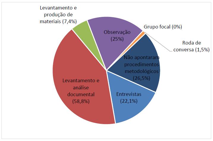 “Roda de conversa” e “levantamento e produção de materiais”, que são procedimentos que, em regra, envolvem maior articulação de participantes e recursos, foram utilizadas com menor frequência, em 2% e 7% dos trabalhos, respectivamente.