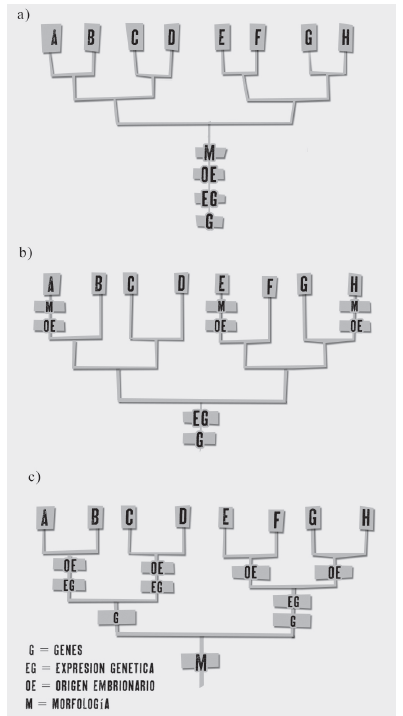 Las tres imágenes que componen la figura representan distintos tipos de relaciones evolutivas entre ocho diferentes taxa (AH). Los niveles de organización incorporados en las representaciones jerárquicas de homología de Abouheif [1997a] son cuatro: morfología (M), origen embrionario (OE), expresión génica (EG) y genes (G). Cada uno de estos correspon de a un nivel de organización propio de un carácter particular en las ocho especies. En la figura se distinguen tres escenarios evolutivos: a) homología verdadera: coincidencia com pleta entre niveles, b) homología profunda: coincidencia entre los dos niveles básicos (genes y su expresión), y c) convergencia de caracteres: conservación de los niveles superiores. Modificado de Abouheif [1997a]. conocido trabajo de Shubin, Tabin y Carroll [2009]— puede aplicarse al análisis de los niveles jerárquicos inferiores que subyacen al funcionamiento de las neuronas espejo. De acuerdo con mi análisis, el modelo propuesto por estos autores no aclara satisfactoriamente si las neuronas espejo de las distintas especies de primates tienen un mismo conjunto de determinantes genético-embriológicos, condición indispensable para un uso válido del término de homología profunda. Al final del trabajo argumento que los estudios recientes de Catmur [2007 y 2008] y Heyes [2010a, 2010b] indican que probablemente no todos los conjuntos de neuronas espejo se derivan de los mismos mecanismos en los niveles inferiores de la jerarquía de niveles de homología de Abouheif. Lo anterior, sugiere que en lugar de homología profunda, la relación jerárquica entre genes, neuronas espejo y conductas de imitación corresponde a otro tipo de homología.