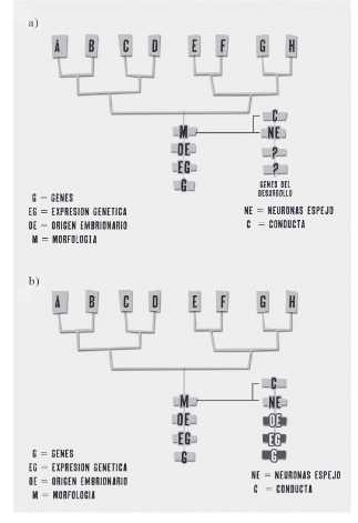 Como anoté previamente, podría suceder que diferentes genes, con expresión genética distinta, fueran reclutados eventualmente —a lo largo de la filogenia de las especies y de la ontogenia de los individuos— para participar en la diferenciación de (las redes de) neuronas espejo. Estas redes sustentarían comportamientos similares, pero éstos no estarían fundamen- tados en la expresión de información compartida —es decir, homóloga, en el sentido clásico— en los niveles más básicos.