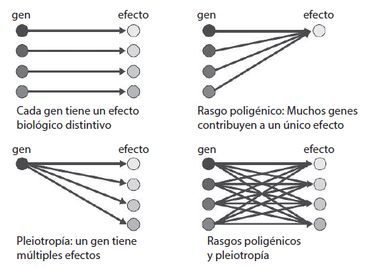 Debemos pensar en los genes como poseedores de cuatro tipos generales de relaciones con los rasgos (figura 1). Primero, un gen puede simplemente ayudar a producir una proteína o varias proteínas, si hay más de un alelo para ese gen). Éste es el modelo simple: “un gen-una proteína”. En un nivel ligeramente más complicado puede haber escenarios en los cuales un grupo de genes trabaje conjuntamente para producir un efecto, como una proteína compleja o un rasgo compuesto de múltiples proteínas (llamado “efecto poligénico”). De manera más complicada, existen situaciones donde un gen tiene muchas repercusiones sobre un número de diferentes rasgos o sistemas. Esto es, sus productos proteicos afectan múltiples sistemas y objetivos finales (a lo cual llamamos “efecto pleiotrópico”). Finalmente, es muy común que los genes tengan efectos poligénicos y pleiotrópicos al mismo tiempo. Debemos recordar que cada gen puede tener más de un alelo; en todos los casos mencionados el mismo gen puede producir proteínas ligeramente disímiles en individuos distintos.