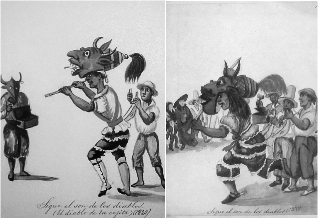 Empezó la música; un viejo tuerto y manco tocaba el violín, con el arco sujeto al muñón del antebrazo; aquél hombre representaba la orquesta permanente. Uno de los danzantes tañía una jícara, sobre la que había estirado un pergamino, de cuyo centro salía un palo que, frotado con los dedos húmedos, emitía unos gruñidos. La mujer tocaba unas sonajas y el tamboril en la quijada bien seca de un asno, golpeando y restregando los dientes con una pieza de hierro, y golpeando el hueso con la mano al debido tiempo, de manera que los dientes flojos cascabeleaban [Gadow (1908) 2011: 370].