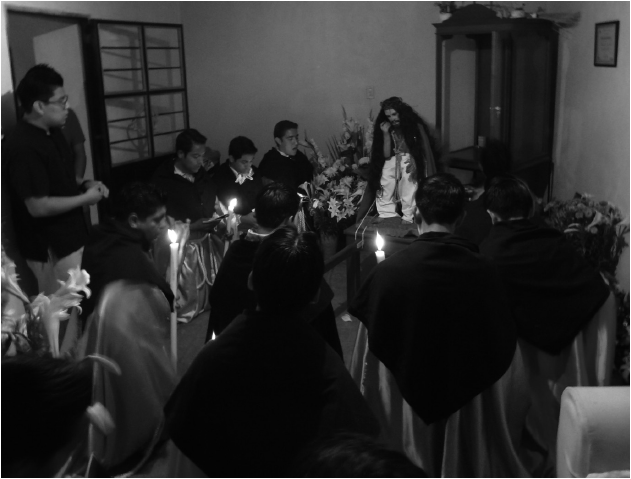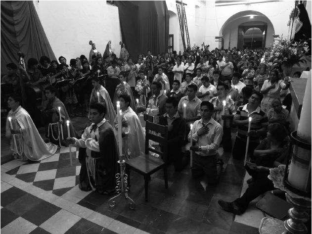 El Apostolado es un cargo dentro de un sistema que ordena la vida religiosa de esta sociedad. En varios rituales del ciclo anual algunos cargos políticos tienen la obligación de participar del culto, esto nos permite sugerir, junto con evidencias etnográficas,14 que el sistema de cargos ordenaba la vida política en el pasado. El Apostolado está obligado a dar forma a gran parte del ciclo ritual anual, y es reconocido en esta sociedad por un rasgo diacrítico: el canto.15 El estilo de “entonar”16 es central en la conformación del Apostolado, pues lo marca de manera exclusiva, ante otras figuras sociales, por esta especialización.