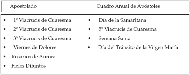 El ciclo anual está fundado en la reactualización de la mitología cristiana que abarca los momentos festivos que rememoran la vida de Cristo (de acuerdo con la liturgia canónica católica) y sucesos bíblicos cristianos, y las celebraciones de los Santos y de las fiestas locales. No en todas las conmemoraciones rituales del ciclo interviene el Apostolado, por lo cual nos centraremos en aquellas donde esta figura social tiene presencia. Estos momentos rituales son los siguientes: