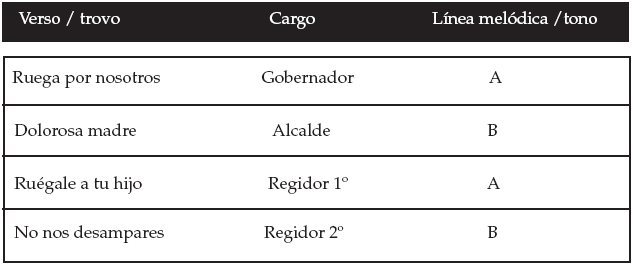La lírica está dividida en la mayoría de las alabanzas por cuartetas. Cada verso (“trovo”) de la cuarteta tiene una línea melódica específica (tono). Generalmente las alabanzas están compuestas por dos tonos que se alternan en los versos de la cuarteta.26 Por ejemplo:
