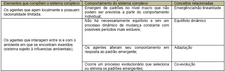 Quanto à definição de sistemas complexos, Casti (1994) afirma que são aqueles tipos de sistema que possuem as “impressões digitais” da complexidade. É importante destacar que há muitas definições diferentes de um sistema complexo, mas em geral ele possui os seguintes elementos: (i) vários agentes heterogêneos; (ii) os agentes agem localmente e possuem racionalidade limitada; (iii) os agentes interagem entre si, o que altera o sistema (emergência de padrões no nível macro que não podem ser previstos a partir do comportamento individual); (iv) não há necessariamente equilíbrio, e sim um processo dinâmico de mudança constante com possíveis períodos mais estáveis; (v) os agentes alteram seu comportamento em resposta do padrão emergente; (vi) ocorre um processo evolucionário, que seleciona ou elimina os padrões emergentes (Wu & Marceau, 2002; Cilliers, 2005; Holland, 1995; Prigogine, 1987).