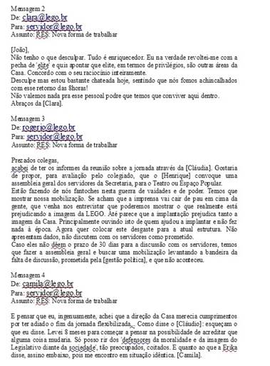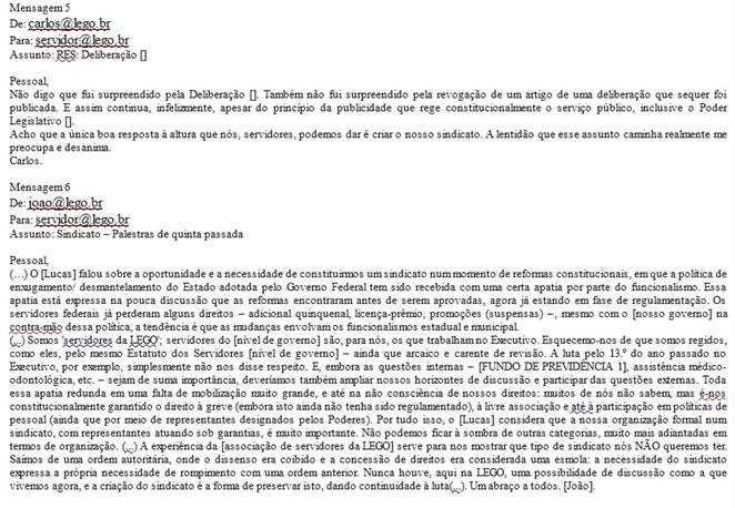 As trocas de e-mails expressas referem-se ao período inicial do GRUPO no final da década de 1990. Apesar dessa seleção, havia outras temáticas levantadas, questionadas, argumentadas e criticadas no GRUPO, demonstrando certa fragmentação entre o próprio grupo que se une para resistir à gestão, mas que possui divergências internas. Desse modo, alguns trabalhadores usavam o GRUPO para debater especificamente e diretamente com outros colegas, fazendo suas críticas, réplicas e tréplicas que perduraram até um momento de ruptura: algumas trocas de ofensas entre eles geraram processo administrativo para averiguação e controle da situação e os gestores da LEGO decidiram desativar o GRUPO, já que ele era hospedado em seu ambiente virtual.