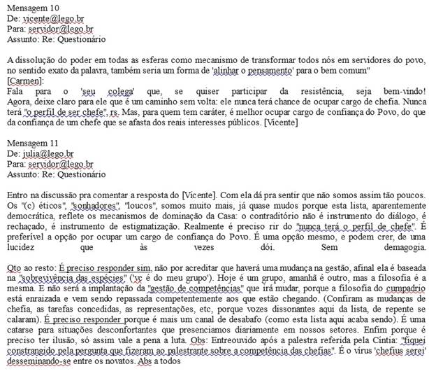 Analisando a troca de e-mails expressa na Figura 6, percebo algumas características do GRUPO nesse período. Nestas três mensagens, há uma densa caracterização do “eu” contra o “outro”. Nos trechos “Estão fazendo de nós fantoches”, “Se acham que a imprensa vai cair de pau em cima da gente”, “Não apresentam dados, não discutem com os servidores como prometido”, “Caso eles não deem o prazo”, a primeira pessoal do plural “nós” é usada para unificar o grupo que sofre as ações em contraposição a “eles” que é o sujeito agente nas orações. Além de fazer essa separação entre “nós” e “eles”, essa relação social é qualificada como uma luta: “Não valemos nada pra esse pessoal podre”, “guerra de vaidades e de poder”, “ouvindo isto de quem ajudou a implantar e não fez nada à época”, “Só posso rir dos 'defensores da moralidade e da imagem do Legislativo diante da sociedade', tão preocupados, coitados”.