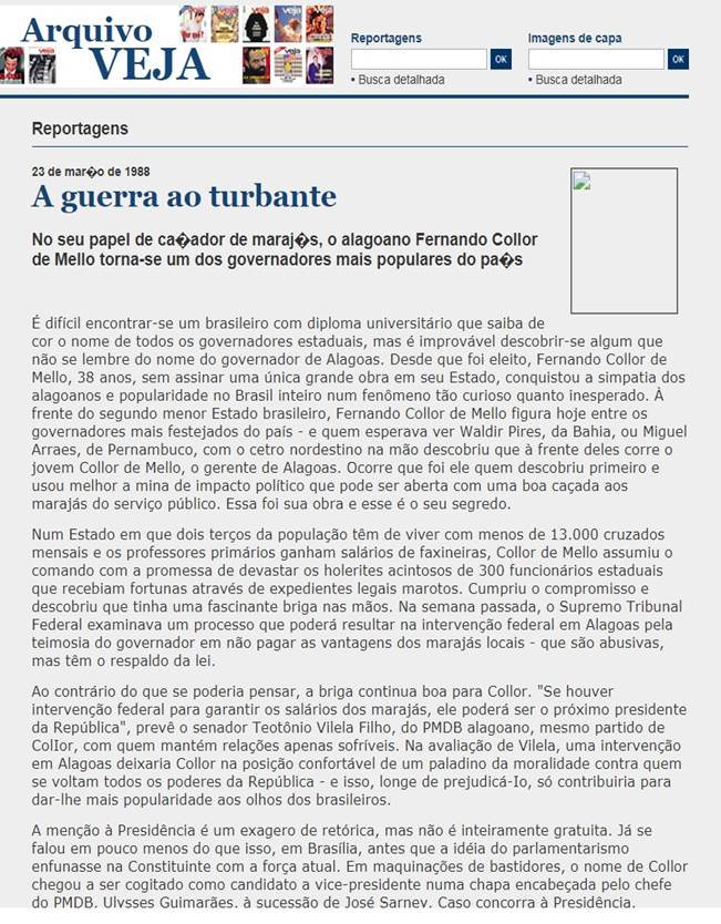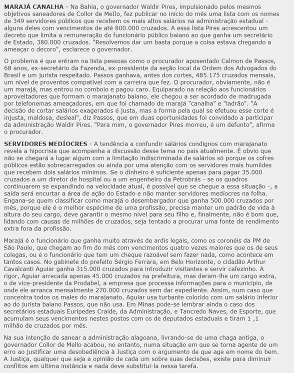 Percebe-se que há uma interdiscursividade entre o discurso organizacional da ineficiência dos funcionários públicos e alguns discursos veiculados na mídia naquela época, como a caça aos marajás. As Figuras 4 e 5 são trechos de uma reportagem veiculada na Revista Veja, no dia 23 de março de 1988, com o título “A guerra ao turbante”.