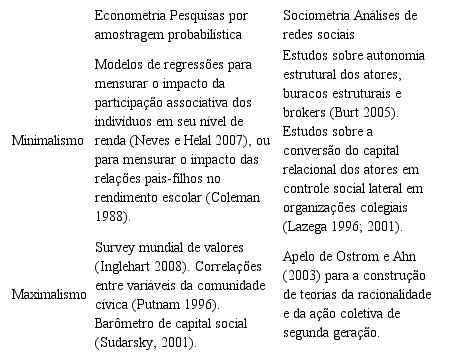 A perspectiva minimalista do capital social avançou muito com a ajuda da análise de rede, resultando na elaboração de teorias, como a do Buraco Estrutural (Burt, 2000), e sobre a força dos laços fracos (Granovetter, 1973). A partir da abordagem da sociometria, pode-se destacar a importância das relações pessoais como uma forma de capital social. Desse modo, espera-se que indivíduos com um maior número de contatos não redundantes – os laços fracos de Granovetter – ou que mantém relações com diferentes grupos em suas comunidades – aqueles que preenchem os buracos estruturais (Burt, 2000) nas suas redes de relações entre seus vizinhos – consigam informações relevantes que facilitam o acesso aos serviços públicos [1] .