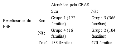 Os dados quantitativos encontrados neste trabalho referem-se à pesquisa “Efeitos de programas de proteção social sobre aspectos menos tangíveis da pobreza: conexão entre ativos, estratégias de resposta e estrutura de oportunidade”, executada pela Fundação João Pinheiro, com subsídio da FAPEMIG e coordenada pela professora Carla Bronzo, realizada em 2010/2011 [3] . O objetivo central deste estudo consistiu em identificar os efeitos dos serviços socioassistenciais desenvolvidos nos CRAS sobre o público beneficiário do Programa Bolsa Família (PBF), em Belo Horizonte/MG. A pesquisa Fundação de Amparo à Pesquisa de Minas Gerais (FAPEMIG) abrangeu um conjunto de 608 famílias e dois grupos focais, um com sete técnicos de dois Centros de Referência da Assistência Social e o outro com famílias atendidas em territórios de abrangência.