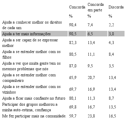 Os dados quantitativos sinalizam que o CRAS constitui uma importante fonte de informações para as famílias atendidas. Na Tabela 2, que retrata as declarações de impacto desse Centro sobre a vida dos entrevistados, 90,5% dos respondentes declararam que tal participação no CRAS ajuda a ter mais informações. Esse fato é muito mais significativo que outros resultados possíveis, como, por exemplo, melhorar o relacionamento familiar e comunitário – objetivo precípuo do CRAS [10] . Nota-se que a percepção do CRAS, enquanto um patrocinador de informações, sugere que a abordagem do capital social que adotamos é mais apropriada para o estudo proposto sobre como políticas públicas podem compensar a falta de capital social das famílias em situação de vulnerabilidade. Vale lembrar que este estudo investigou se o CRAS é capaz de gerar ganhos particulares para as famílias atendidas, através dos quais essas resolvem os problemas que afligem seus membros. Os dados apontam que, do ponto de vista dos grupos familiares, o capital social mais importante gerado pelo CRAS parece não ser o do tipo maximalista sugerido pela abordagem de Putnam (1996, 2002). Apenas 59,7% dos entrevistados declararam que o CRAS os tornaram mais participativos na comunidade. Famílias buscam o centro de referência para se inserirem na rede de proteção social e alcançar os benefícios disponíveis para seus membros. Elas procuram por informações e direitos traduzíveis em melhorias nas suas condições de vida.