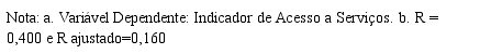 Antes de finalizar esta seção, informamos que para corroborar a regressão foi realizado o teste de média, no qual, “participar do CRAS” era a variável independente e o “Indicador de Acesso a Serviços” a variável dependente. A Tabela ANOVA também foi significativa a 95%. Em uma escala de 0 a 7, pessoas que não participam do CRAS tem o potencial de acessar 0,46 serviços para resolver seus problemas e pessoas que participam do CRAS o potencial de acessar 1,22 serviços.